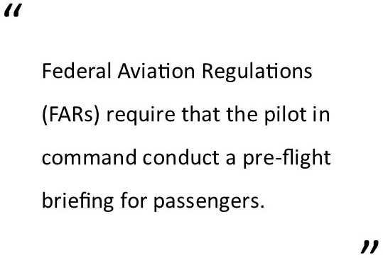 Pilot: “Good morning, it’s a beautiful day for flying. I’ve checked the weather and completed all my calculations for take-off and landing distances, fuel requirements, Notices to Air Missions (NOTAM’s), filed the flight plan with the FAA and we are good to go. Before we get started, and before I complete my pre-flight inspection of the airplane, I want to give you a safety briefing. Please listen carefully and pay attention as this briefing is primarily for your safety. Just like when you fly on a commercial airline and you get their safety briefing, I’m required by Federal Air Regulations to provide you with a briefing before we fly.”