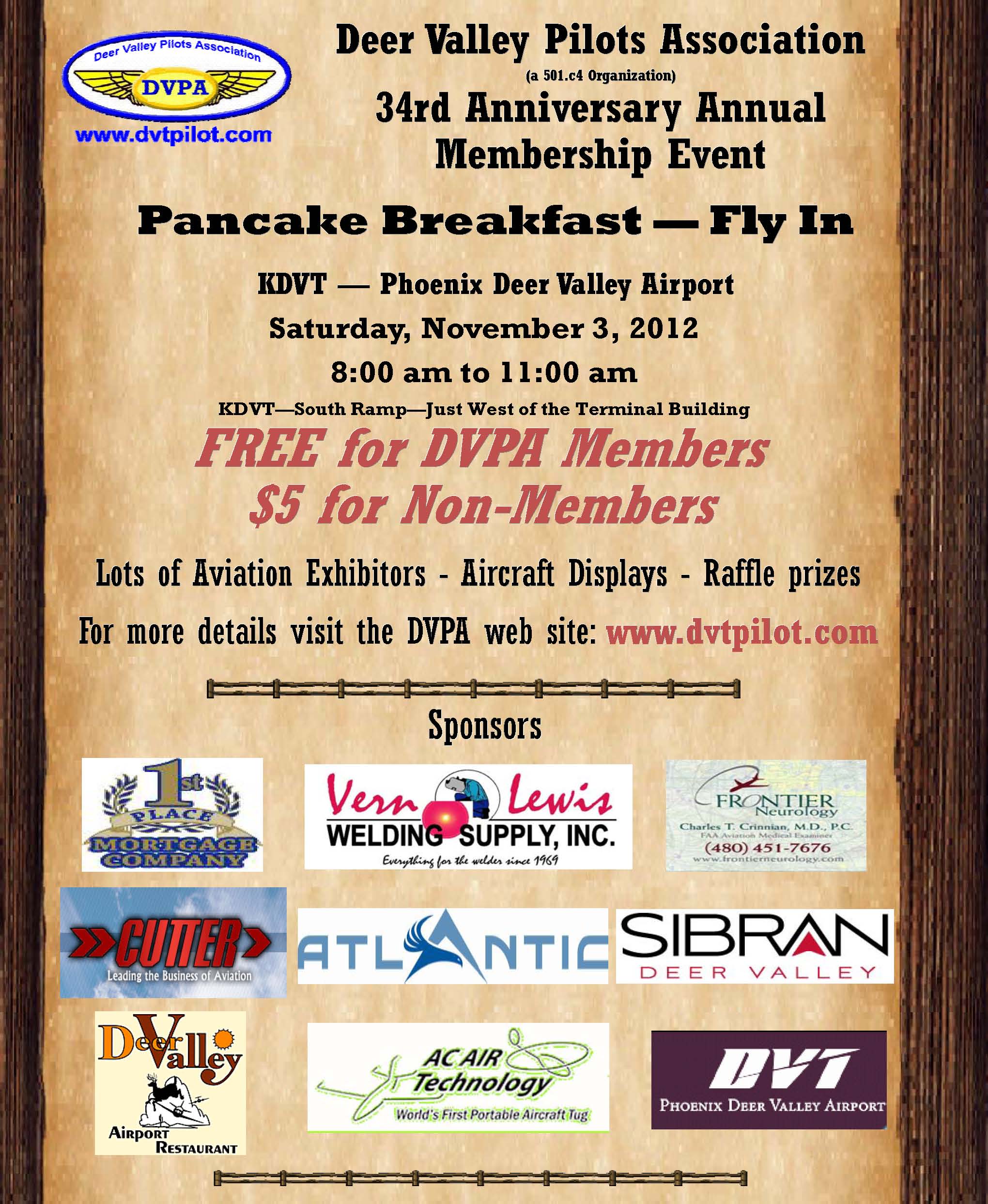 | This year, the Deer Valley Pilots Association will host our first fly in pancake breakfast. See area aviation vendors, aviation organizations, static aircraft displays. All Arizona pilots invited-see what's happening at the busiest GA airport in the entire world. Free to current DVPA members, Fly-In Guests $5. 8:00-11:00 on the south ramp - just west of the terminal building. |
